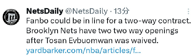 随着厄沃马离队,意味着篮网现在腾出两个双向合同名额。篮网媒体NetsDaily对此表示,曾凡博等3人是两个双向合同的候选人。3人竞争两个名额,至少数据上成功概率能高达67%。