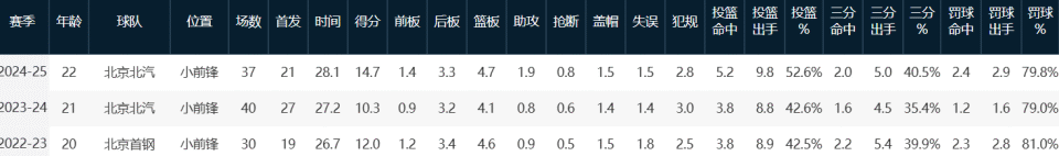 上赛季在CBA效力北京队的曾凡博,常规赛场均14.7分4.7板1.9助1.5帽,场均以40.5%命中率扔进2记三分球;季后赛则场均15分4.2板1助1断1.6帽,场均以43.3%命中率扔进2.6记三分球。