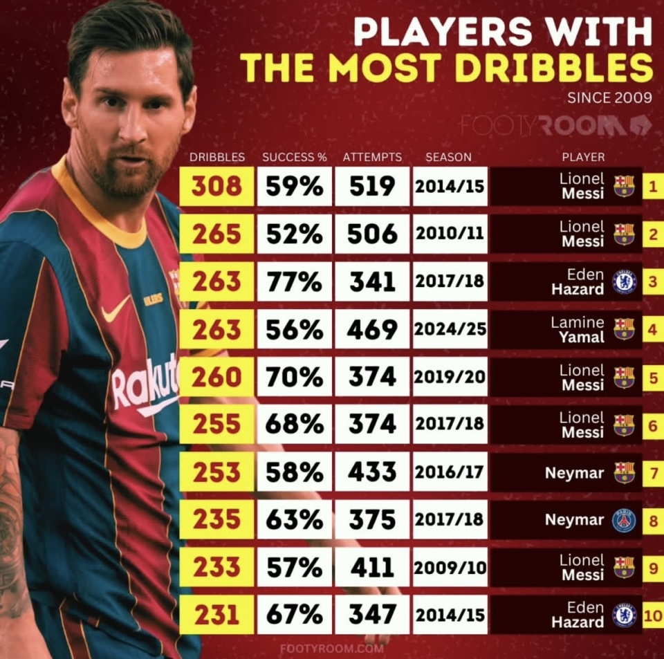 自2009年以来,盘带数据成为衡量球员带球突破能力最直接的标准之一。从数据库中提取的顶级球员单赛季盘带纪录,代表了多年来世界足坛个人能力的天花板。下面,先让我们完整看一看过去十五年单赛季盘带成功次数最多的十大纪录: